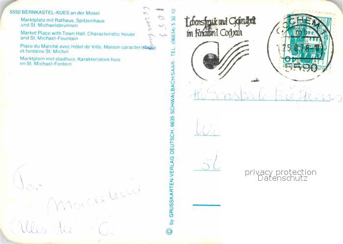 72886311 alte Postkarte Bernkastel-Kues Marktplatz Rathaus Spitzenhaus St. Michaelsbrunnen postalisch gelaufen Erhaltung siehe scans [LiesaD40] KatCode: 11110007231008