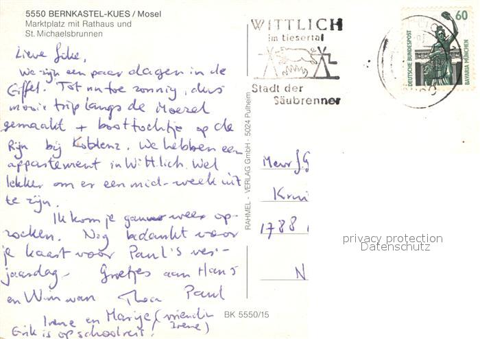 72941355 alte Postkarte Bernkastel-Kues Marktplatz Rathaus St. Michaelsbrunnen postalisch gelaufen Erhaltung siehe scans [PaolaD17] KatCode: 11110007231008