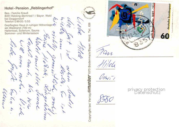 72891217 alte Postkarte Bernried Niederbayern Hotel Pension Reblingerhof postalisch gelaufen Erhaltung siehe scans [WerneD78] KatCode: 11110009271116