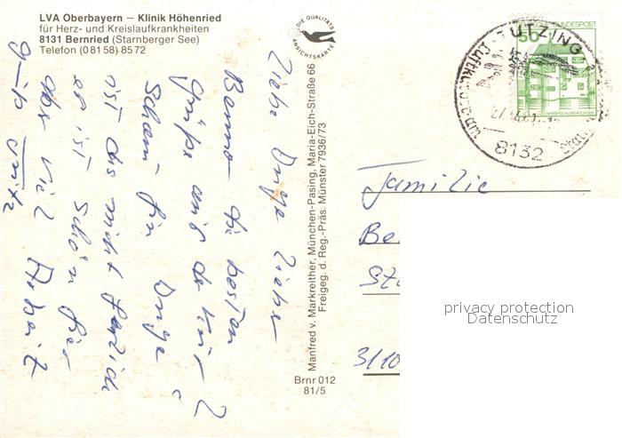 72937330 alte Postkarte Bernried Starnberger See Klinik Hoehenried Fliegeraufnahme postalisch gelaufen Erhaltung siehe scans [WerneD78] KatCode: 11110009190115