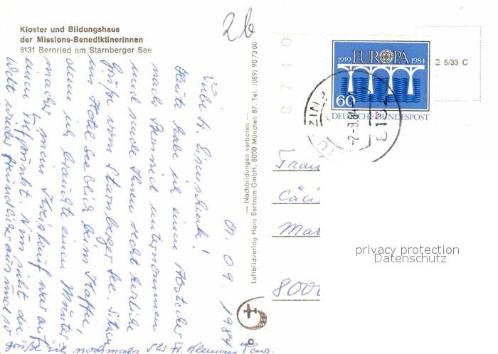 72754053 alte Postkarte Bernried Starnberger See Kloster und Bildungshaus Fliegeraufnahme postalisch gelaufen Erhaltung siehe scans [LiesaD40] KatCode: 11110009190115
