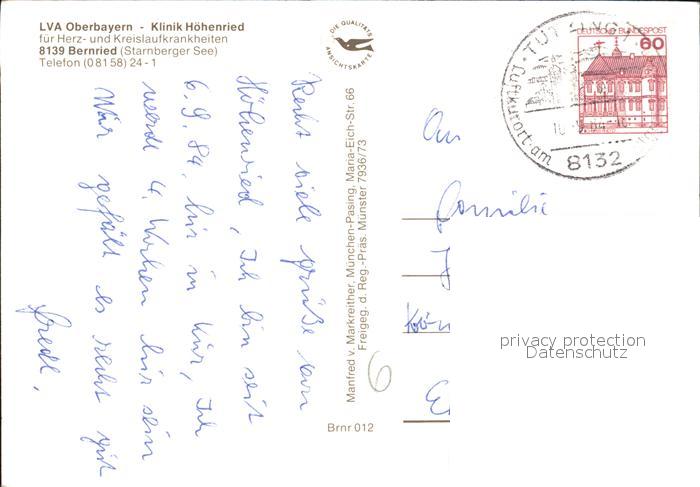 alte Postkarte Bernried Starnberger See LVA Oberbayern Klinik Hoehenried Fliegeraufnahme postalisch gelaufen Erhaltung siehe scans
