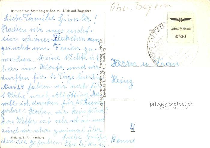 72064941 alte Postkarte Bernried Starnberger See mit Blick auf Zugspitze Alpenpanorama Fliegeraufnahme postalisch gelaufen Erhaltung siehe scans KatCode: 11110009190115