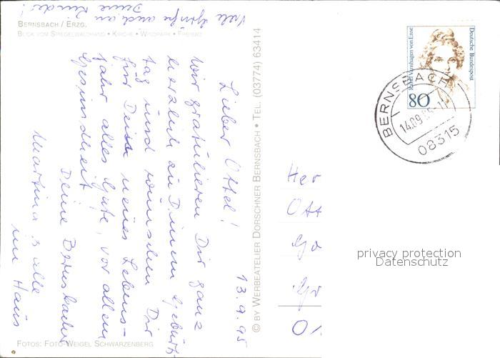 72373314 alte Postkarte Bernsbach Kirche Windpark Freibad postalisch gelaufen Erhaltung siehe scans KatCode: 11110014191070
