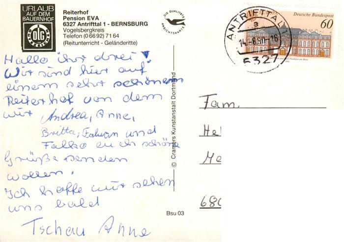 73885541 alte Postkarte Bernsburg Antrifttal Reiterhof Pension Eva Pferdekoppel Pferdekutsche Restaurant postalisch gelaufen Erhaltung siehe scans [WerneD78] KatCode: 11110006535002