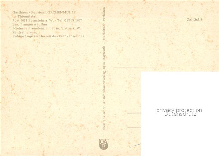 73652900 Bernstein Wald Gasthaus Pension Lorchenmuehle Restaurant Thiemitztal postalisch nicht gelaufen Erhaltung siehe scans [FriedD77] KatCode: 11110009475169