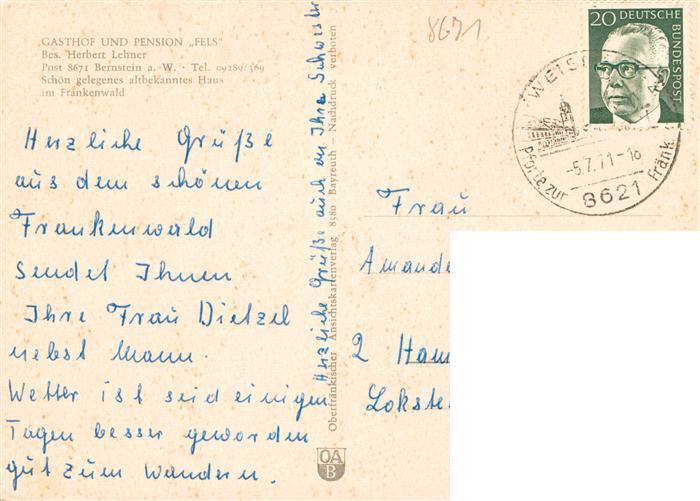 73936393 alte Postkarte Bernstein Wald Gasthof Pension Fels postalisch gelaufen Erhaltung siehe scans [WerneD78] KatCode: 11110009475169