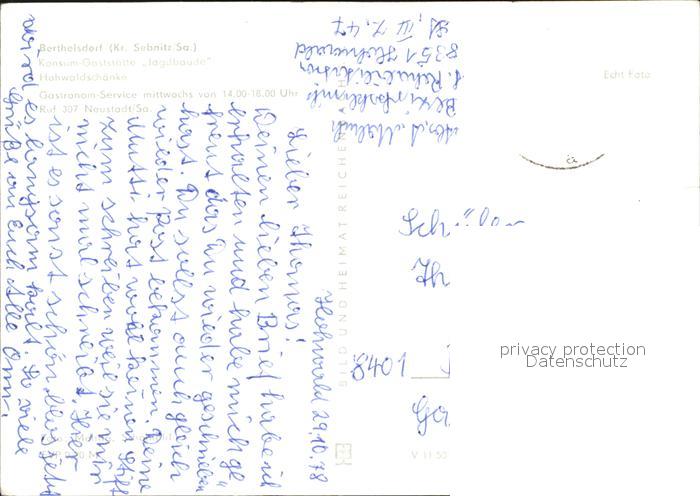 72407991 alte Postkarte Berthelsdorf Sebnitz Konsum Gaststaette Jagdbaude Hohwaldschaenke postalisch gelaufen Erhaltung siehe scans KatCode: 11110014287370