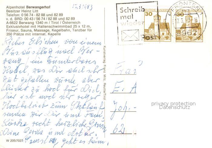 73125241 alte Postkarte Berwang Tirol Alpenhotel Berwangerhof postalisch gelaufen Erhaltung siehe scans [NatalD47] KatCode: 11390331070802