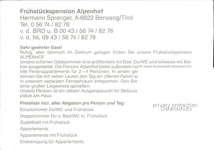 72417356 Berwang Tirol Fruehstueckspension Alpenhof postalisch nicht gelaufen Werbekarte (keine Postkarte) Erhaltung siehe scans KatCode: 11390331070802