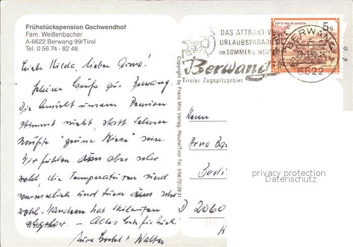 72539289 alte Postkarte Berwang Tirol Fruehstueckspension Gschwendhof postalisch gelaufen Erhaltung siehe scans [AndreD76 kt119box] KatCode: 11390331070802