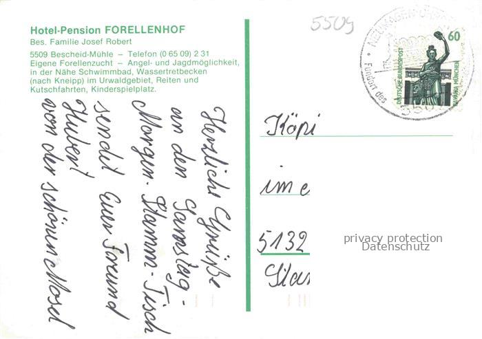 74054695 alte Postkarte Bescheid Hermeskeil Hotel Pension Forellenhof Bescheidermuehle Forellenzucht postalisch gelaufen Erhaltung siehe scans [FriedD77] KatCode: 11110007235005