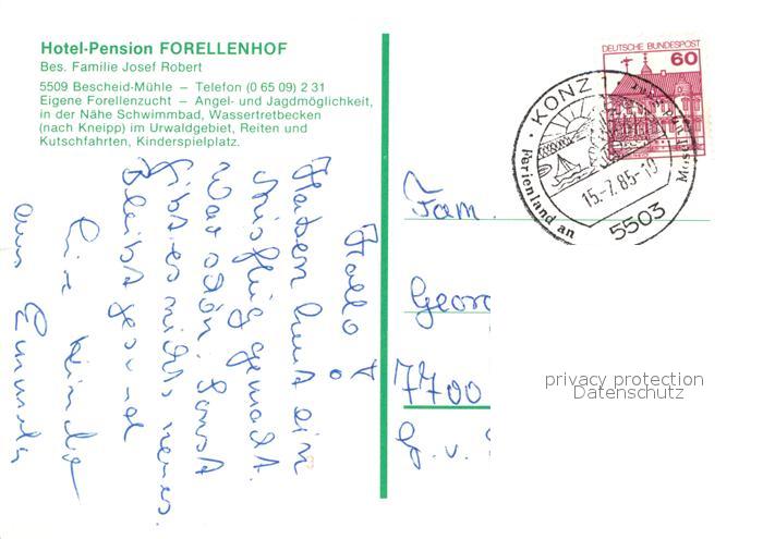 73606756 alte Postkarte Bescheid Hermeskeil Hotel Pension Forellenhof Flugaufnahme postalisch gelaufen Erhaltung siehe scans [LiesaD40] KatCode: 11110007235005