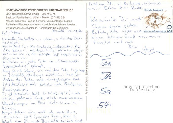 72050429 Besenfeld Hotel Gasthof Pferdekoppel Unterwiesenhof Pferdeschlitten Winterpanorama postalisch nicht gelaufen Erhaltung siehe scans KatCode: 11110008237073