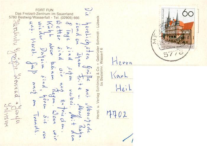 73942887 alte Postkarte Bestwig Fort Fun Freizeit Zentrum Eingang Panorama Sessellift postalisch gelaufen Fliegeraufnahme Erhaltung siehe scans [WerneD78] KatCode: 11110005958008