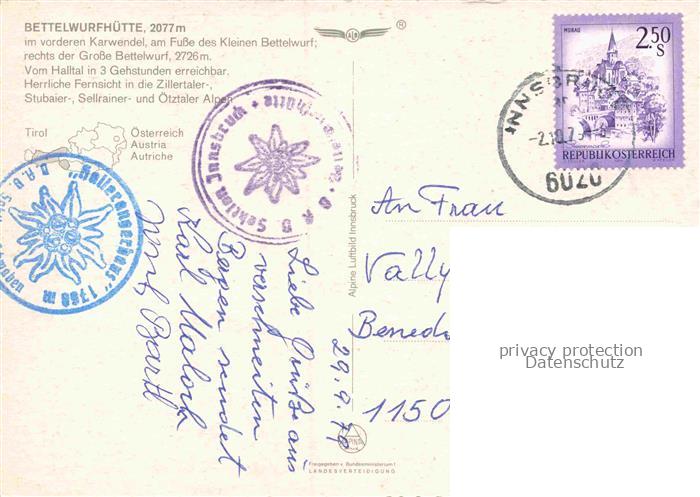 74157571 alte Postkarte Bettelwurfhuette 2250m Hall Tirol AT Karwendel Felsenwand Berge Gipfel Schneefeld Halltal Alpenverein-Stempel postalisch gelaufen Fliegeraufnahme Erhaltung siehe scans [Karloger] KatCode: 11390332070354