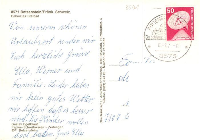 73937185 alte Postkarte Betzenstein Kirche Freibad Ortsansicht postalisch gelaufen Erhaltung siehe scans [WerneD78] KatCode: 11110009472118