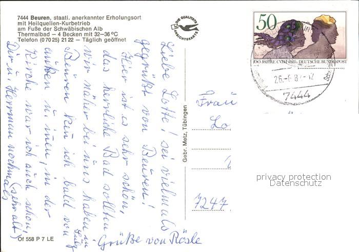 72420704 alte Postkarte Beuren Nuertingen Heilquellen Kurbetrieb am Fusse der Schwaebischen Alb postalisch gelaufen Erhaltung siehe scans KatCode: 11110008116011