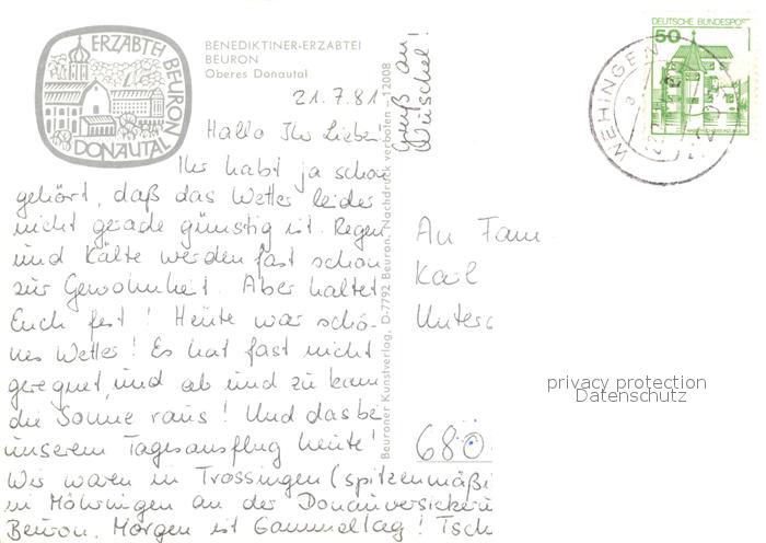 73070699 alte Postkarte Beuron Donautal Benediktiner Erzabtei postalisch gelaufen Erhaltung siehe scans [FriedD77] KatCode: 11110008437005