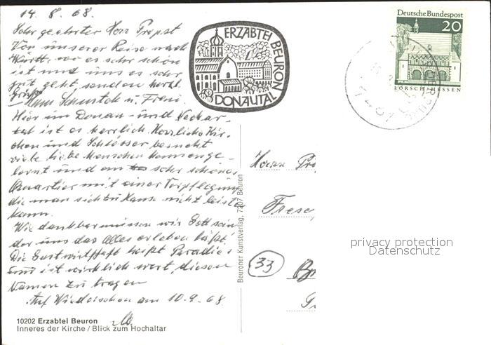 72201679 alte Postkarte Beuron Donautal Erzabtei innen postalisch gelaufen Erhaltung siehe scans KatCode: 11110008437005