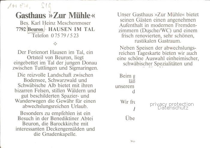 72296257 Beuron Donautal Gasthaus zur Muehle postalisch nicht gelaufen Werbekarte (keine Postkarte) Erhaltung siehe scans KatCode: 11110008437005