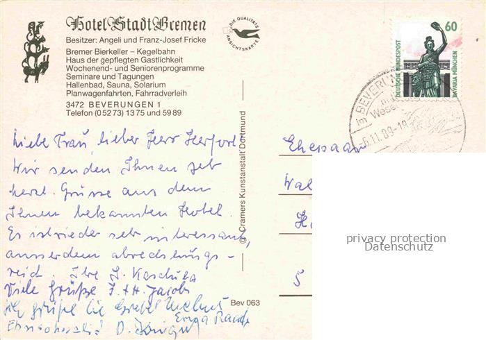74084694 alte Postkarte Beverungen Hotel Stadt Bremen Gastraeume Bremer Bierkeller postalisch gelaufen Erhaltung siehe scans [WerneD78] KatCode: 11110005762008