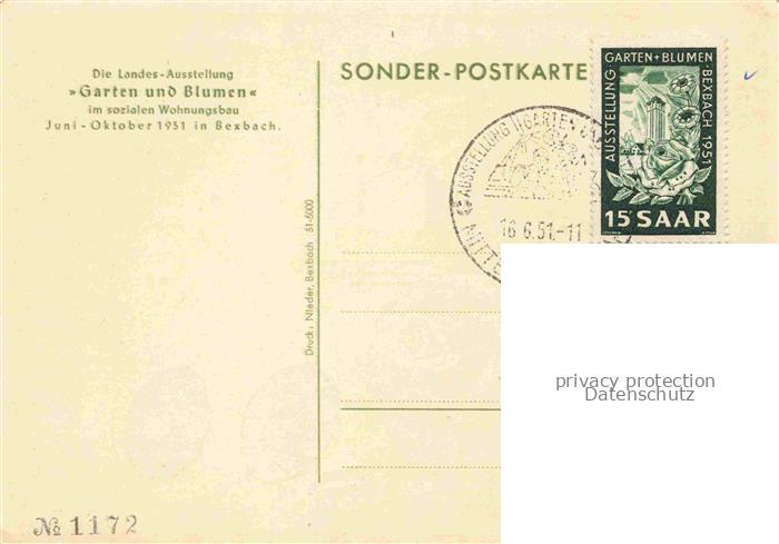 74058818 alte Postkarte Bexbach Saarland Ausstellung des Saarlandes Garten und Blumen Sondermarke postalisch gelaufen Erhaltung siehe scans [FriedD77] KatCode: 11110010045111