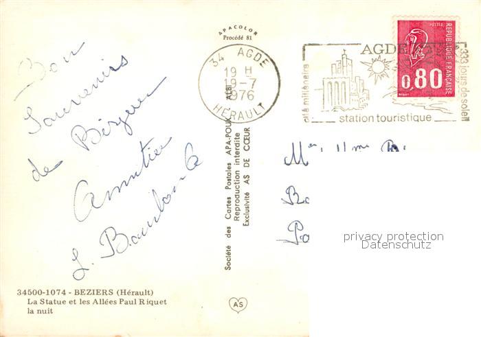 13660650 Beziers La Statue et les Allees Paul Riquet la nuit postalisch gelaufen Erhaltung siehe scans [WerneD78] carte postale Wern Katcode 11170034134032