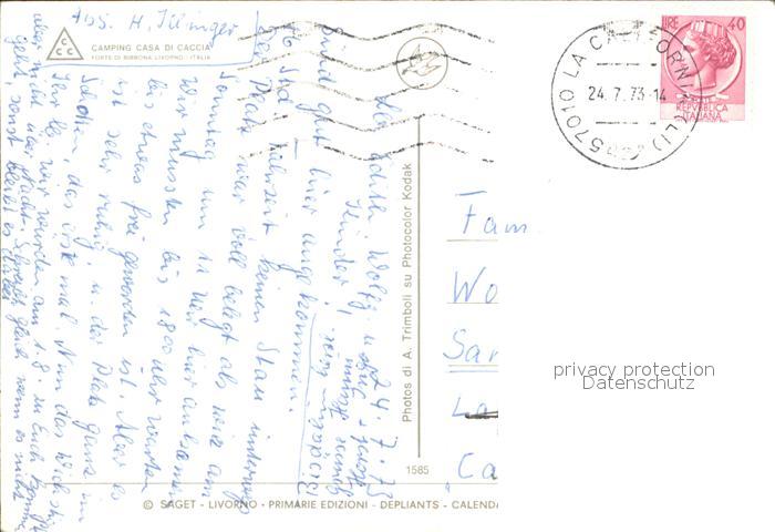 old postcard Bibbona Livorno Camping Casa di Caccia Strandpartie Restaurant Zeltplatz Fahnen postalisch gelaufen Erhaltung siehe scans