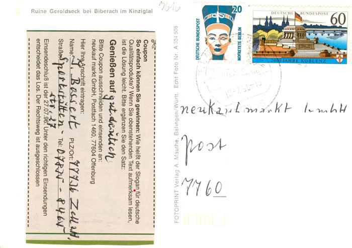 73931133 alte Postkarte Biberach Baden Ruine Geroldseck postalisch gelaufen Erhaltung siehe scans [FriedD77] KatCode: 11110008317011