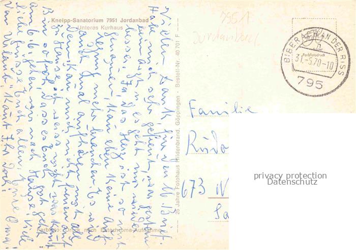 74050985 alte Postkarte BIBERACH Riss BW Kneipp Sanatorium Jordanbad postalisch gelaufen Erhaltung siehe scans [WerneD78] KatCode: 11110008426021