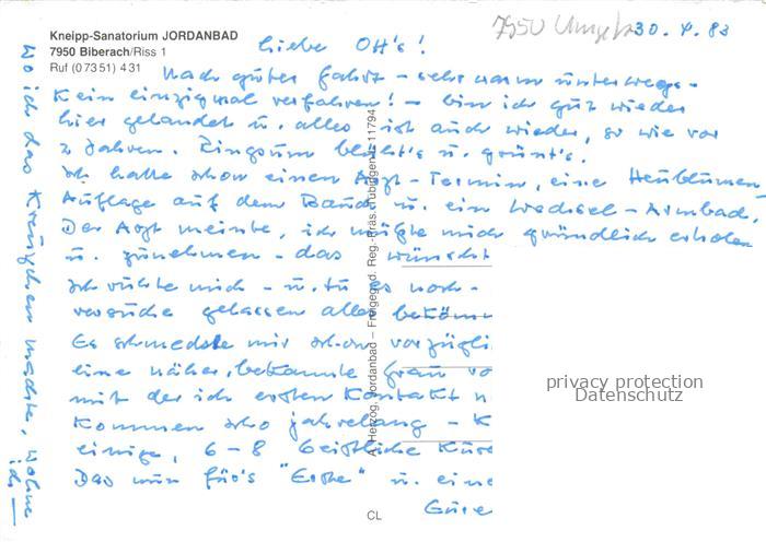 74050835 BIBERACH Riss BW Kneipp Sanatorium Jordanbad postalisch nicht gelaufen Fliegeraufnahme Erhaltung siehe scans [WerneD78] KatCode: 11110008426021