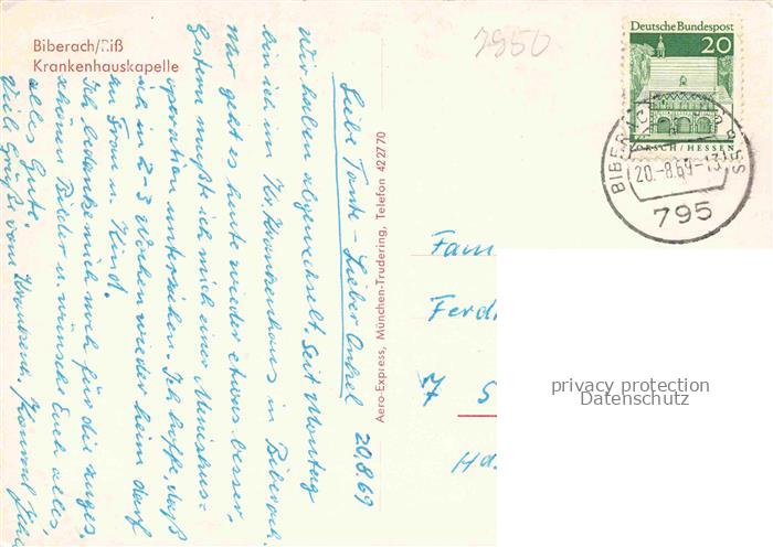 74050813 alte Postkarte BIBERACH Riss BW Krankenhauskapelle postalisch gelaufen Erhaltung siehe scans [WerneD78] KatCode: 11110008426021