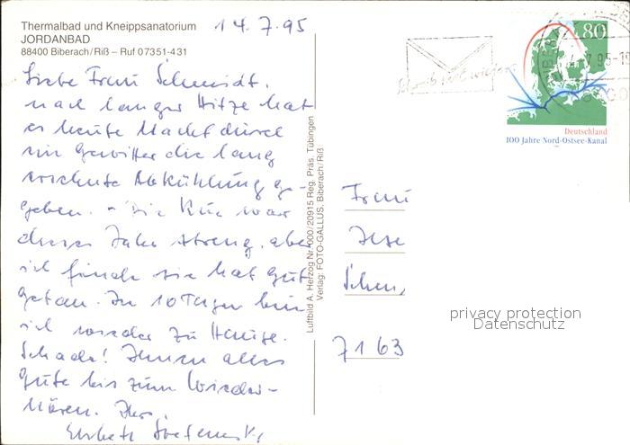 71993272 alte Postkarte Biberach Riss Fliegeraufnahme Jordansbad postalisch gelaufen KatCode: 11110008426021