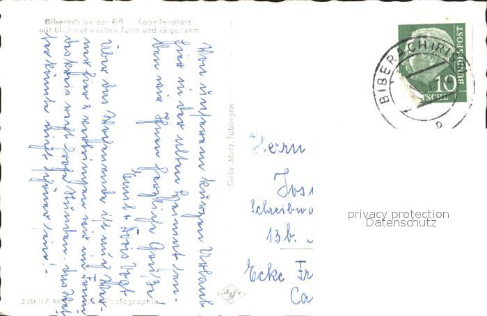 71983293 alte Postkarte Biberach Riss Kapellenplatz mit Weissem Turm und Gigelturm postalisch gelaufen Erhaltung siehe scans KatCode: 11110008426021