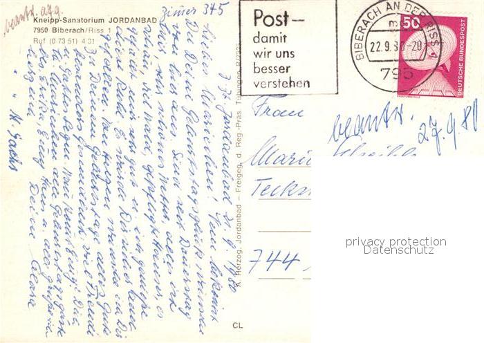 73101473 alte Postkarte Biberach Riss Kneipp Sanatorium Jordanbad postalisch gelaufen Erhaltung siehe scans [WerneD78] KatCode: 11110008426021