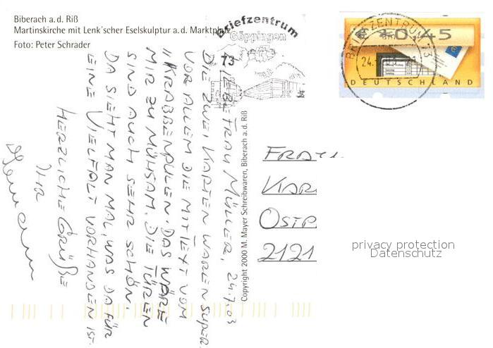 73197783 alte Postkarte Biberach Riss Martinskirche Lenkscher Eselkulptur Marktplatz postalisch gelaufen Erhaltung siehe scans [NatalD47] KatCode: 11110008426021