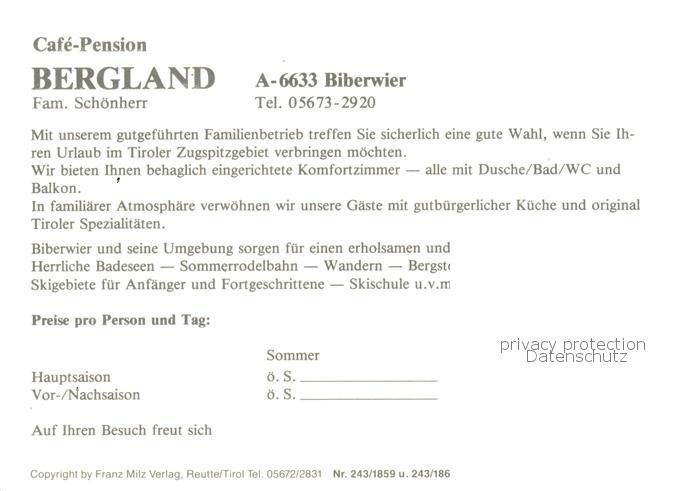73796601 Biberwier Tirol Cafe Pension Bergland postalisch nicht gelaufen Werbekarte (keine Postkarte) Erhaltung siehe scans [WerneD78] KatCode: 11390331070803