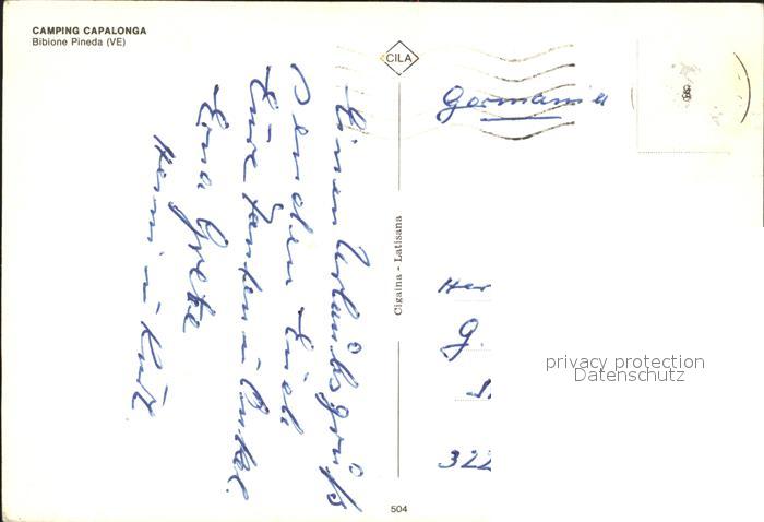 old postcard Bibione Camping Capalonga Bibione Pineda Strandpartie Fischerboot Abenddaemmerung postalisch gelaufen Erhaltung siehe scans