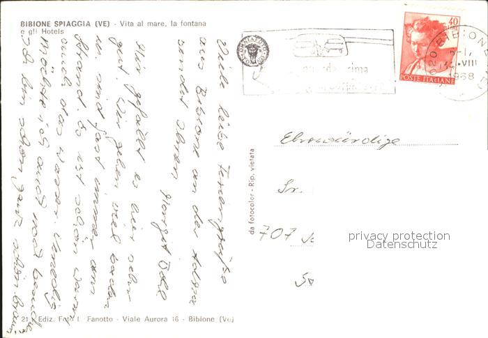old postcard Bibione Spiaggia Vista al mare la fontana e gli Hotels postalisch gelaufen Erhaltung siehe scans