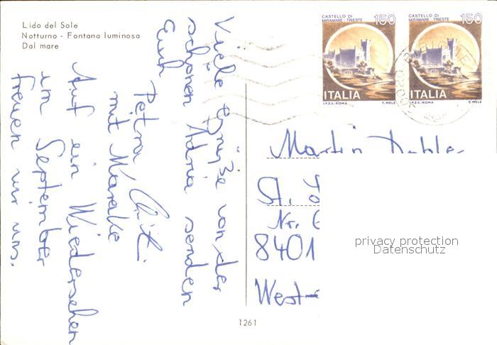 old postcard Bibione Strand Springbrunnen Segelboot postalisch gelaufen Erhaltung siehe scans
