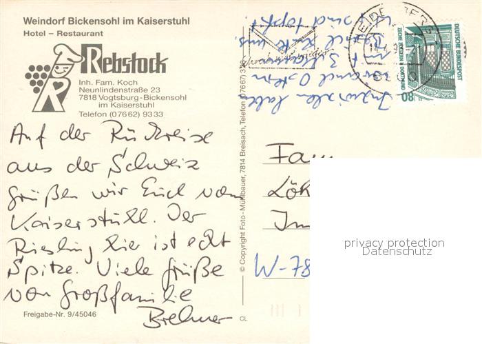 73713886 alte Postkarte Bickensohl Fliegeraufnahme Hotel Restaurant Rebstock postalisch gelaufen Erhaltung siehe scans [WerneD78] KatCode: 11110008315133