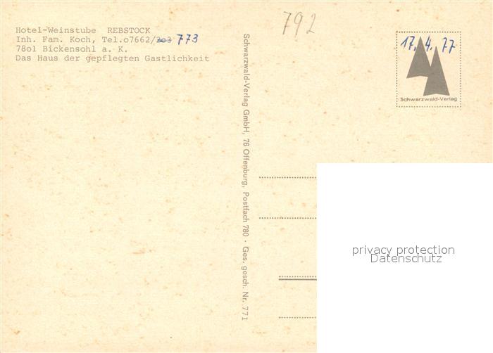 73333058 Bickensohl Hotel Weinstube Rebstock postalisch nicht gelaufen Erhaltung siehe scans [LiesaD40] KatCode: 11110008315133
