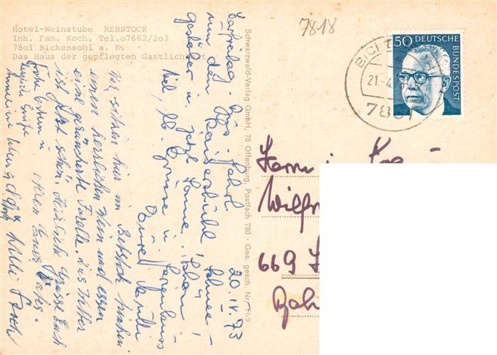 73929155 alte Postkarte Bickensohl Vogtsburg Kaiserstuhl Hotel Weinstube Rebstock postalisch gelaufen Erhaltung siehe scans [WerneD78] KatCode: 11110008315133