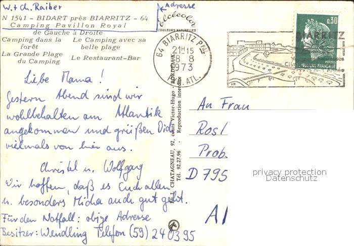 12034481 carte postale Bidart Camping Pavillon Royal Strand Segeln postalisch gelaufen Erhaltung siehe scans KatCode: 11170064164125