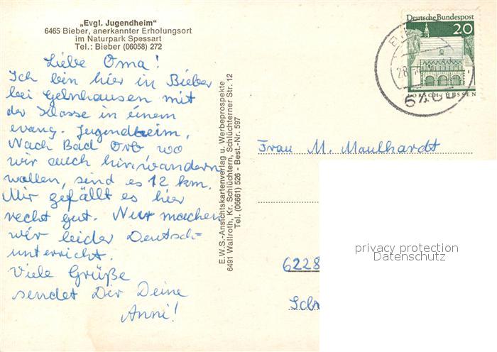73135647 alte Postkarte Bieber Spessart Evgl Jugendheim Freibad Kapelle Landschaftspanorama Naturpark Spessart postalisch gelaufen Erhaltung siehe scans [FriedD77] KatCode: 11110006435003