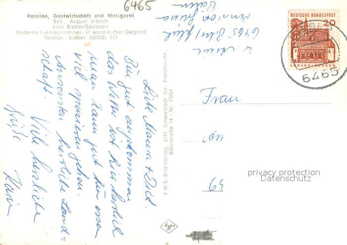 73699203 alte Postkarte Bieber Spessart Gasthaus Gruener Baum Pension Wasserrad Kirche Panorama postalisch gelaufen Erhaltung siehe scans [FriedD77] KatCode: 11110006435003