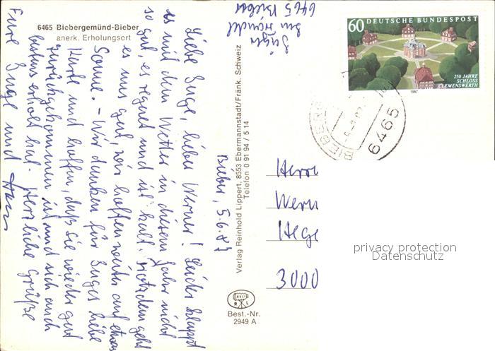 72481875 alte Postkarte Biebergemuend Bieber Kirche Panoramen postalisch gelaufen Erhaltung siehe scans KatCode: 11110006435003