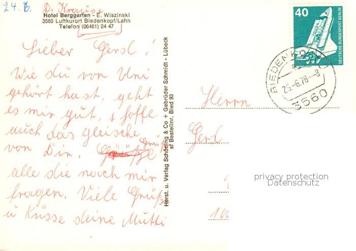 73846239 Biedenkopf Lahn Hotel Berggarten postalisch gelaufen Erhaltung siehe scans [WerneD78] alte Postkarte Wern Katcode 11110006534004