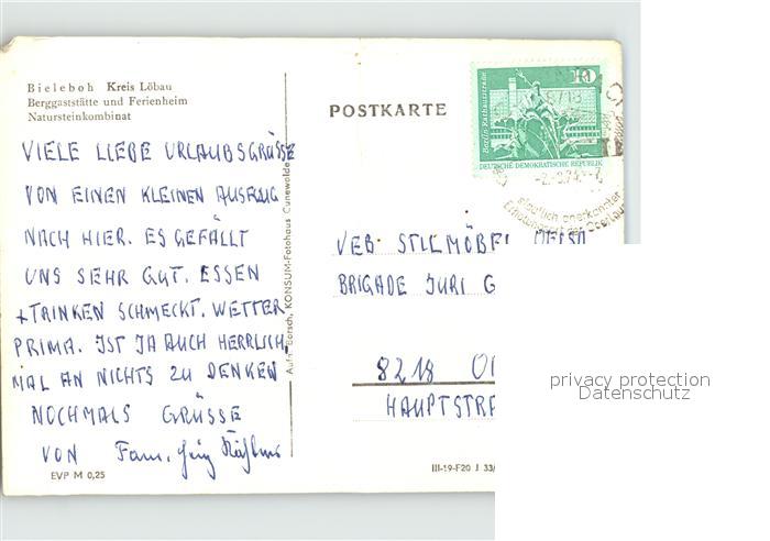 72413165 alte Postkarte Bieleboh Berggaststaette Ferienheim Natursteinkombinat Aussichtsturm postalisch gelaufen Erhaltung siehe scans KatCode: 11110014286010